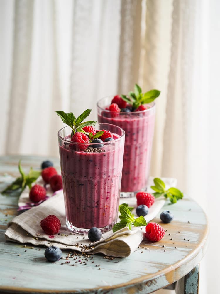 Pour into a tall glass or portable cup. Add a few whole berries on top for garnish or sprinkle some chia seeds for a nice finish. Serve immediately while it’s cold and fresh.