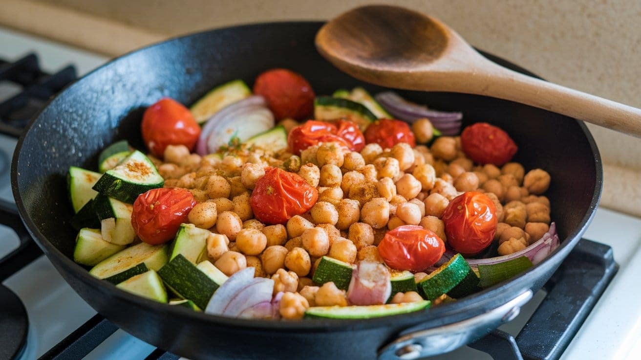 Heat olive oil in a skillet over medium heat. Add onion and garlic, sautéing until fragrant. Stir in zucchini and cook until softened. Add cherry tomatoes, chickpeas, and spices (paprika, oregano, salt, and pepper), mixing well. Cook for 5 minutes.