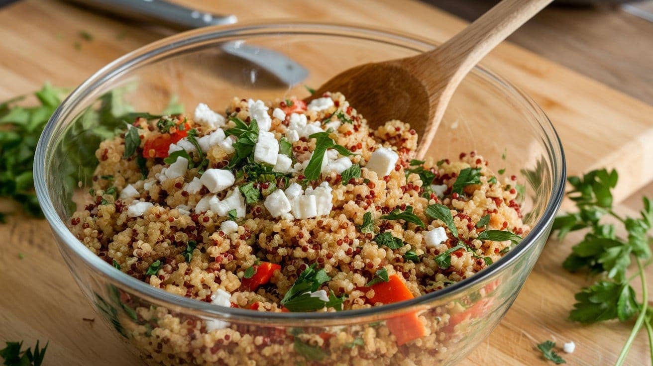 In a large bowl, mix the cooked quinoa, sautéed vegetables, feta cheese, and parsley. Adjust seasoning as needed.