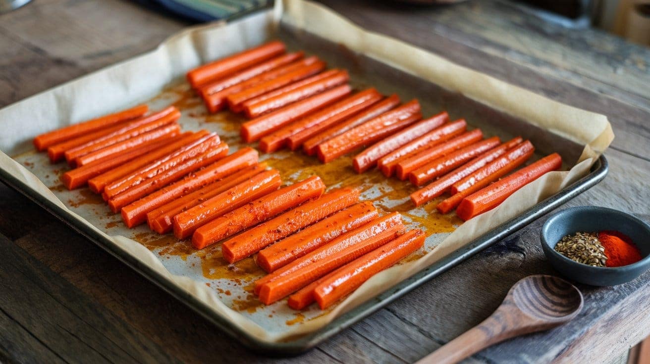 - Toss the carrot strips with olive oil, smoked paprika, cumin, garlic powder, salt, and black pepper. Spread them evenly on the baking sheet.