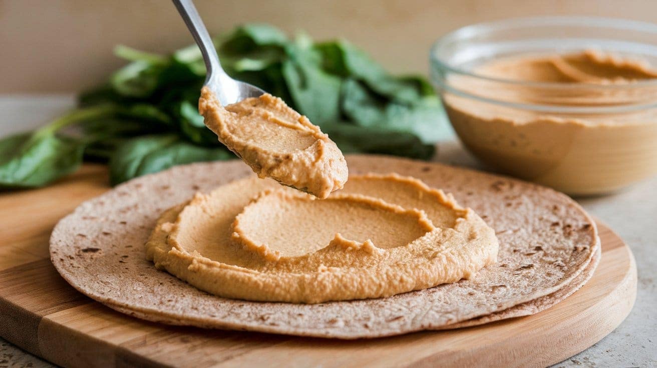 - Spread 2-3 tbsp of hummus over each tortilla.