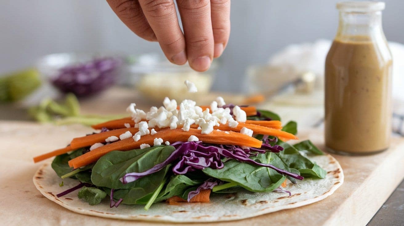 - Arrange a handful of baby spinach, shredded red cabbage, and roasted carrots in the center of each tortilla.