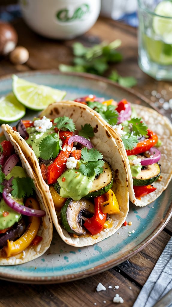 Colorful, flavorful, and packed with nutrients, these Roasted Veggie Tacos with Avocado Crema are the perfect weeknight vegetarian meal. Crisp roasted vegetables are tucked into warm tortillas and topped with a smooth, zesty avocado crema. This easy-to-make, healthy taco recipe is ideal for lunch, dinner, or meal prep.