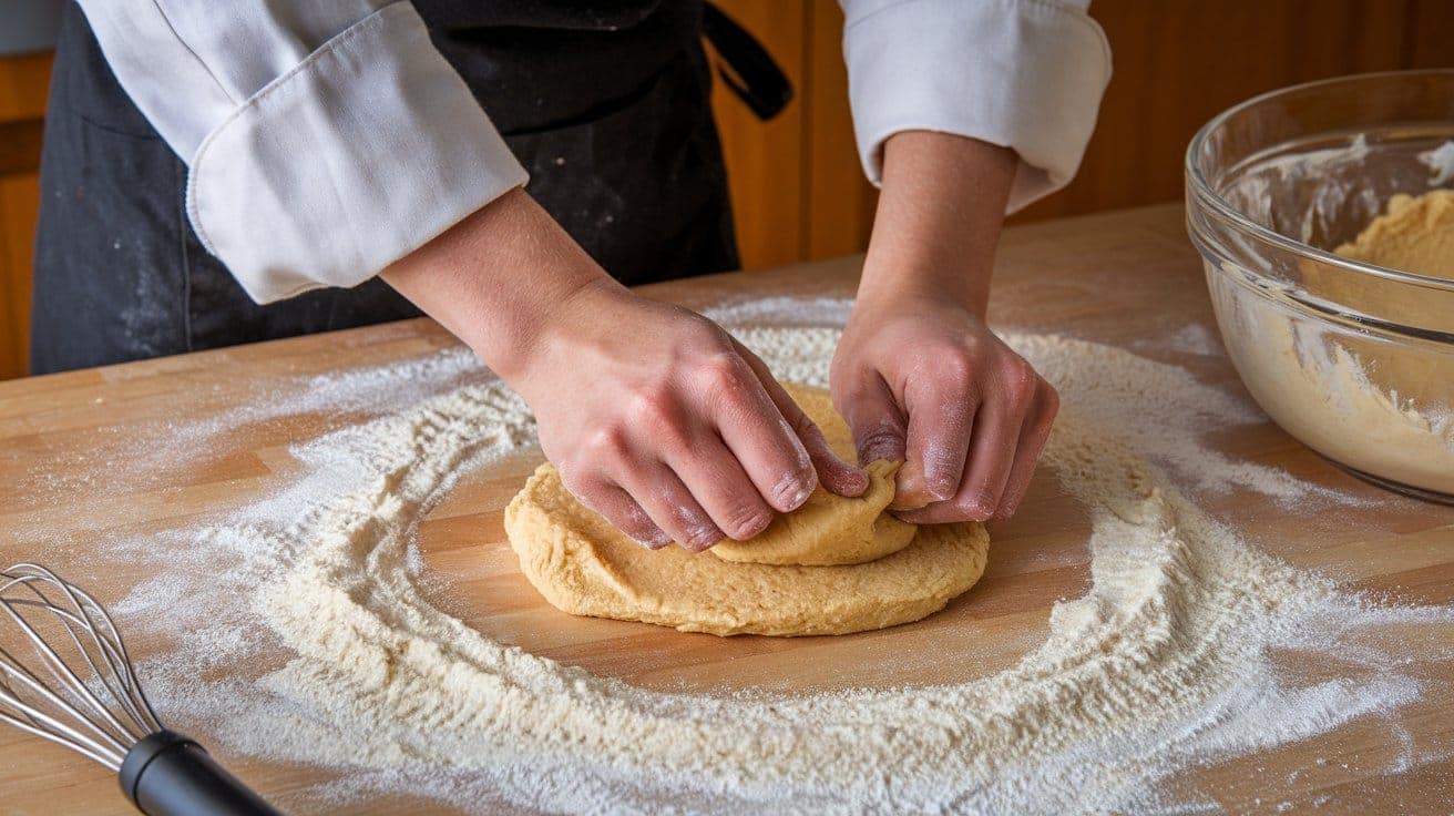 Turn the dough onto a lightly floured surface. Gently knead it 5-6 times, just until it holds together. Over-kneading can make the biscuits tough.