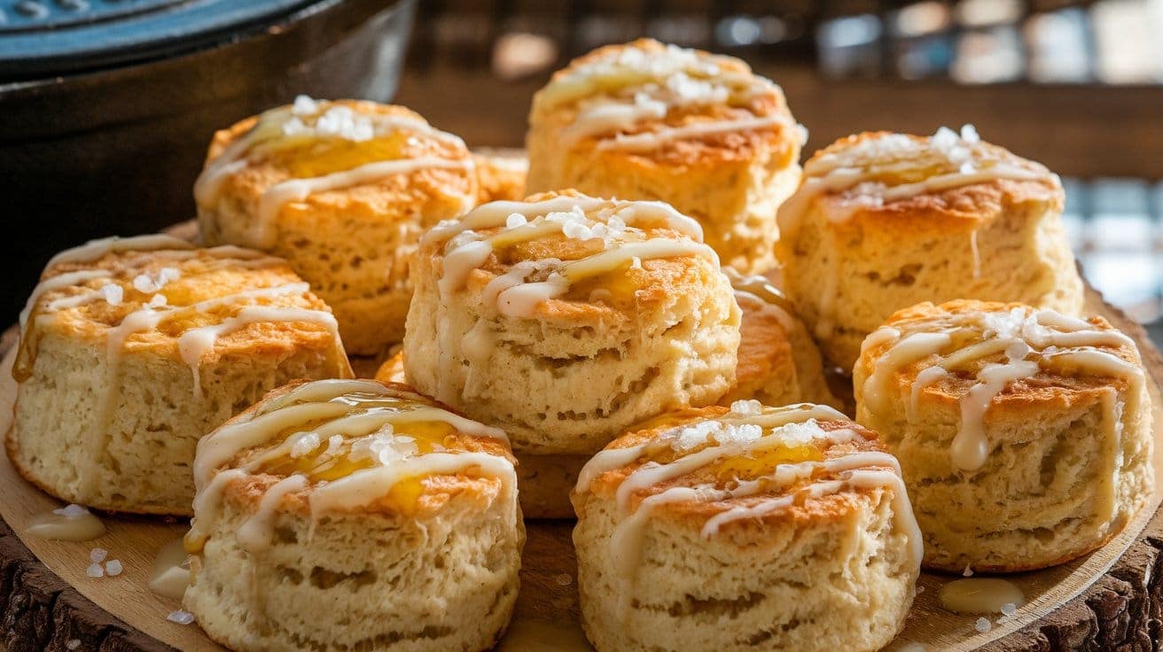 Once baked, remove the Dutch oven from heat. Brush the tops of the biscuits with 2 tablespoons of melted butter and drizzle with 1 tablespoon of honey. Sprinkle with 1 teaspoon of coarse sea salt to enhance the flavors.