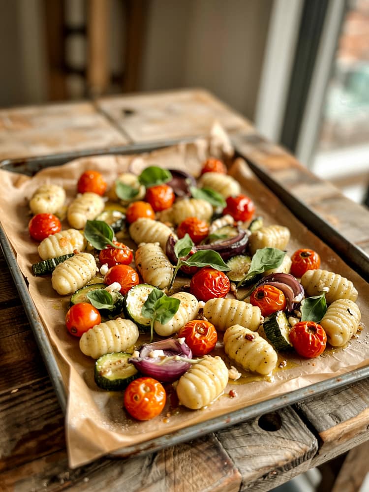 Roast for 20–25 minutes, stirring halfway through. The gnocchi should be golden and crispy, and the vegetables tender and slightly browned.
