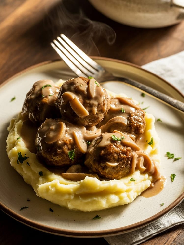 This modern twist turns those seasoned patties into juicy meatballs and lets the slow cooker do the heavy lifting. The meatballs simmer low and slow in a rich, homemade gravy made with sautéed mushrooms, caramelized onions, beef broth, and a splash of Worcestershire sauce.