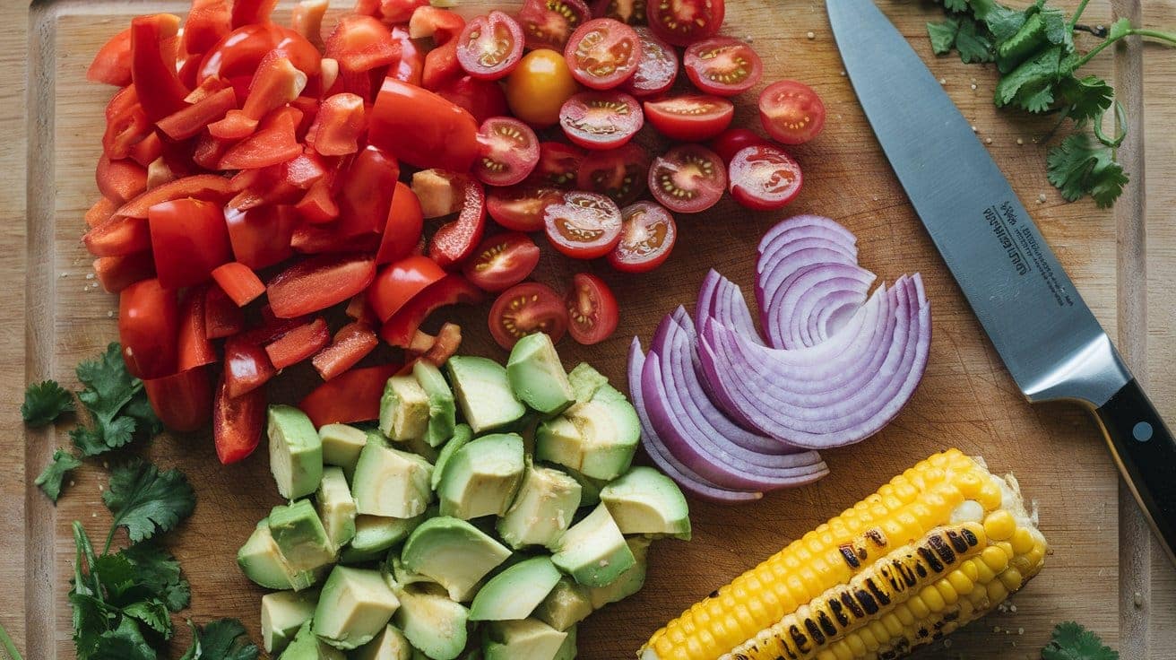 Dice the bell pepper, slice the red onion, halve the cherry tomatoes, and cube the avocado. Grill the corn if desired. Set all the veggies aside.