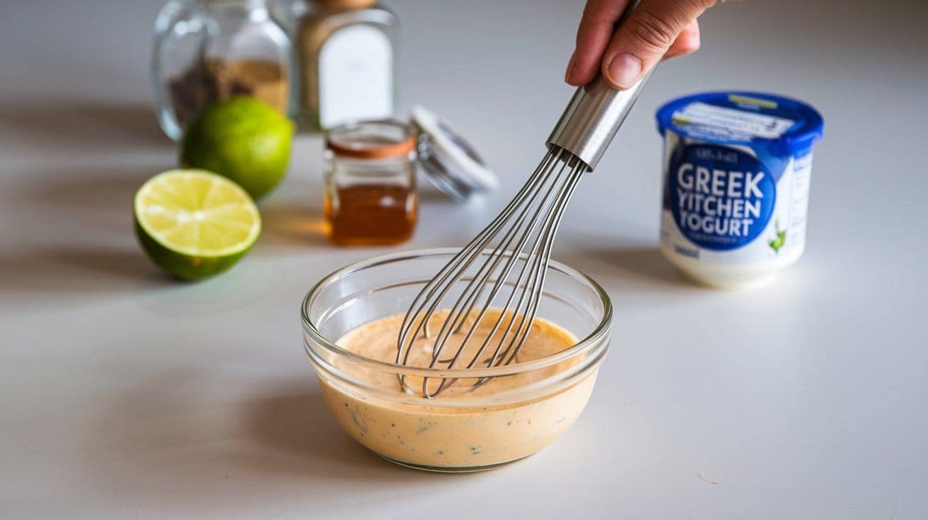- In a bowl, whisk together mayonnaise or Greek yogurt, lime juice, olive oil, vinegar, and spices.