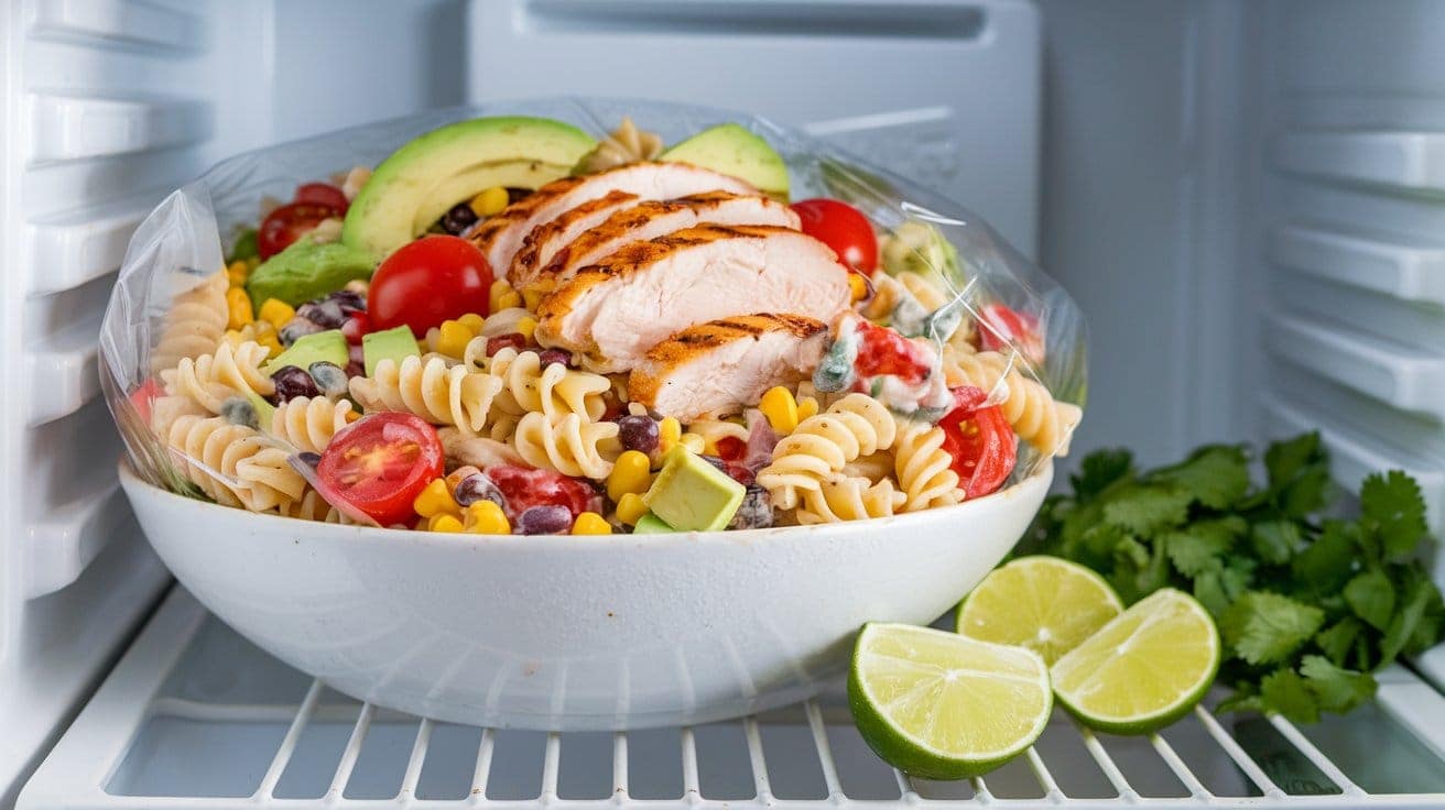 Transfer the salad to a serving dish, garnish with optional toppings, and enjoy your homemade Southwest Chicken Pasta Salad!