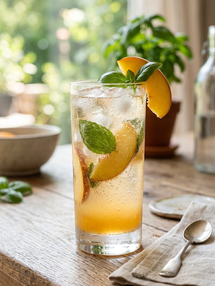 Garnish with fresh basil leaves, peach slices, and optional lemon slices. Serve immediately while chilled and fizzy.
