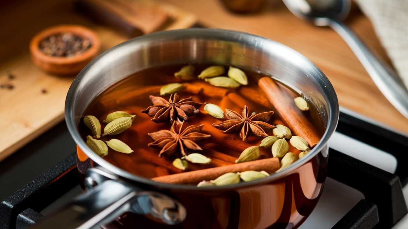- Boil Water & Infuse Spices: In a saucepan, bring 1 cup of water to a gentle boil. Add the cinnamon stick, cloves, cardamom, ginger, peppercorns, and star anise (if using). Let the spices simmer for 5 minutes to release their essential oils.