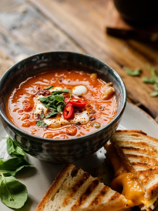 Serve the grilled cheese sandwiches on the side—or go all in by dipping them directly into the soup for that unbeatable combination of crisp bread, gooey cheese, and creamy, spicy goodness.