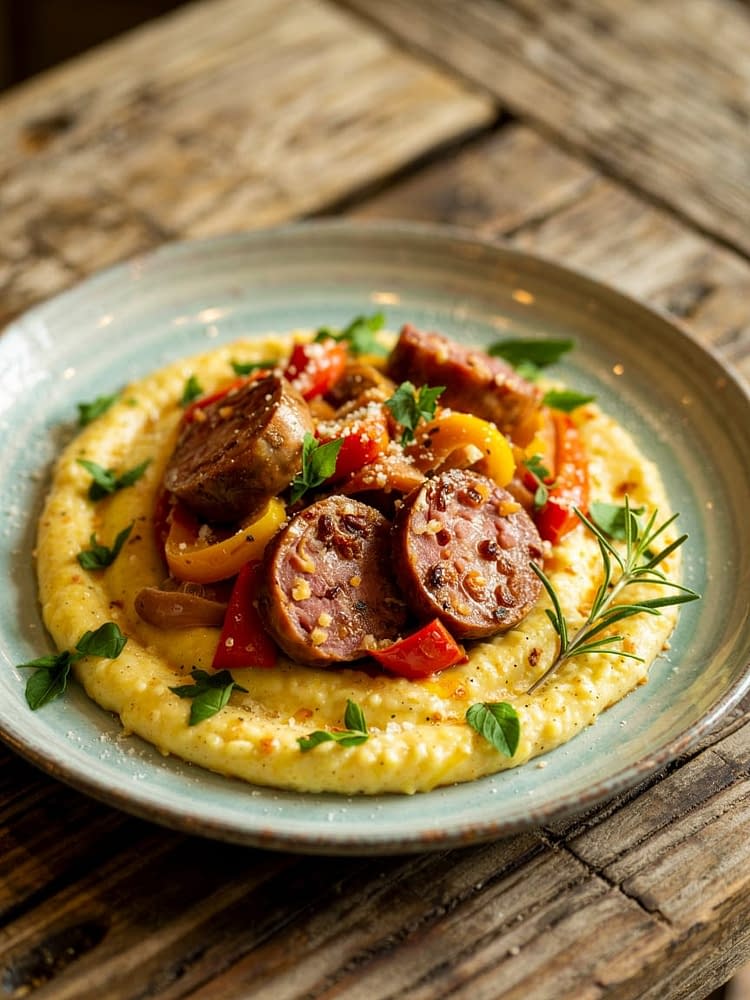 - Spoon a generous portion of creamy herbed polenta onto each plate. Top with the sausage and peppers mixture. Garnish with fresh parsley. Serve hot.