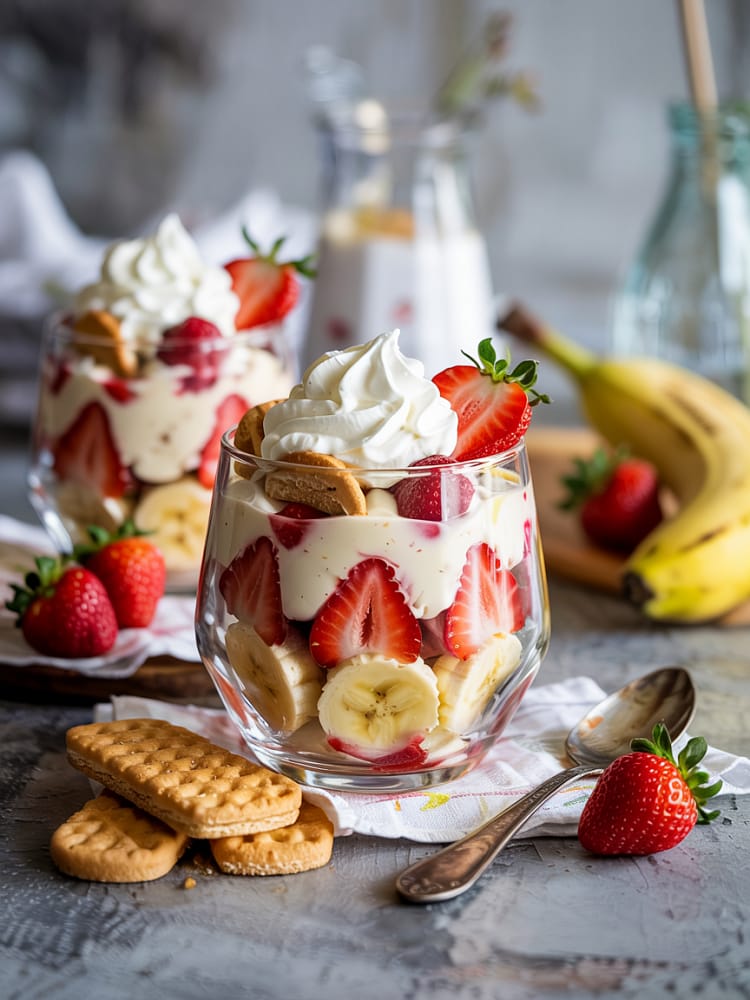 Strawberries add a natural sweetness and a juicy texture that balances the creaminess of the pudding. Bananas bring a smooth sweetness and a tender bite. Lemon juice stops the bananas from browning too quickly, keeping your layers visually appealing.