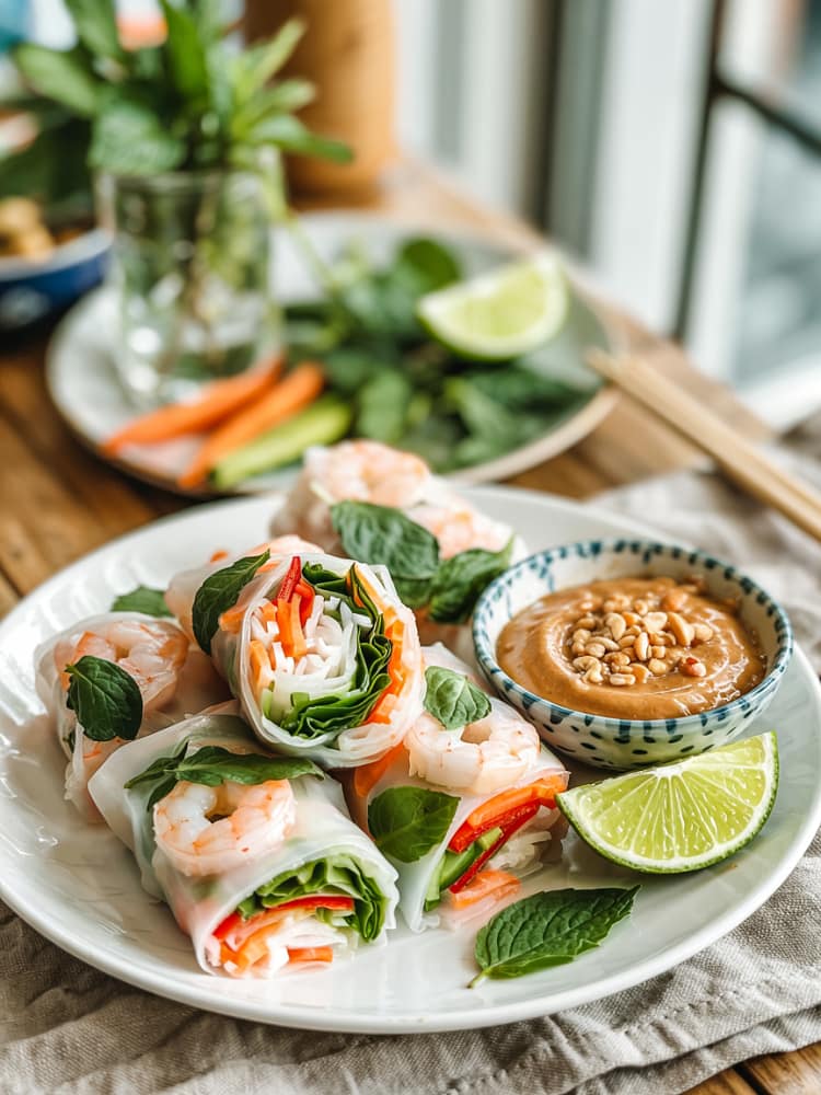 These Summer Rice Paper Rolls with Mint & Peanut Dipping Sauce are the perfect light and refreshing appetizer for warm weather. Filled with crisp vegetables, fresh herbs, and vermicelli noodles, and paired with a creamy, sweet-savory peanut dipping sauce, these Vietnamese-inspired rolls are healthy, easy to make, and bursting with flavor. Great for lunch, snacks, or party platters.