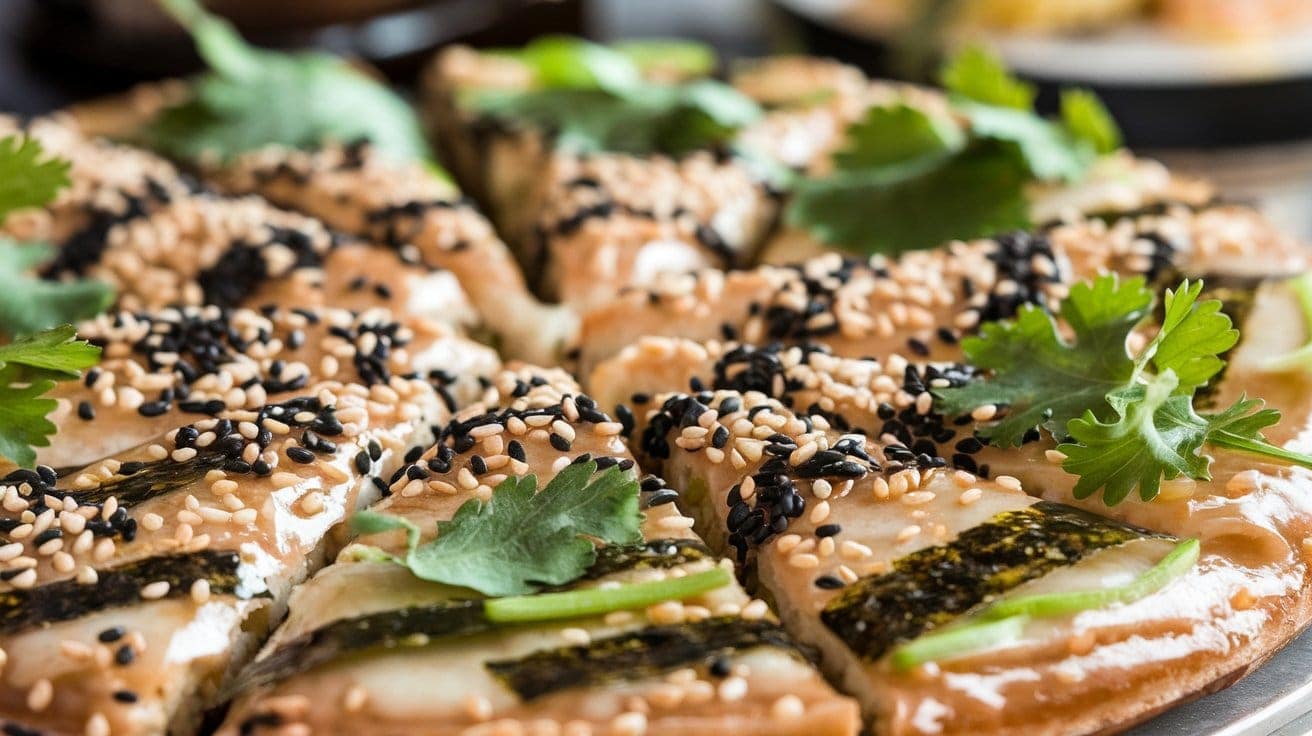 Finish the sushi pizza by sprinkling the toasted black and white sesame seeds evenly across the top. Add thin strips of nori for an extra layer of texture and flavor. Optionally, garnish with fresh cilantro for a pop of green and added freshness. These final touches not only enhance the visual appeal but also contribute to the overall taste profile of the dish.