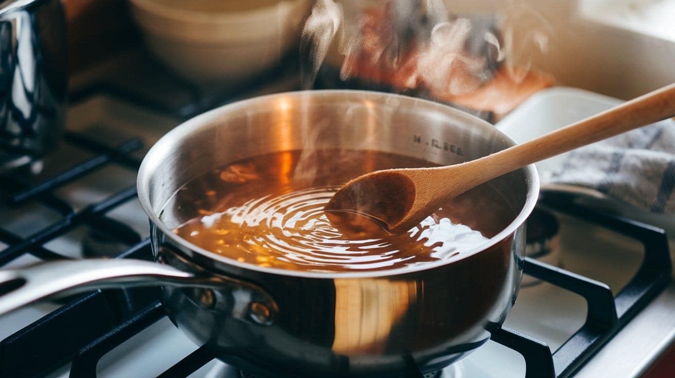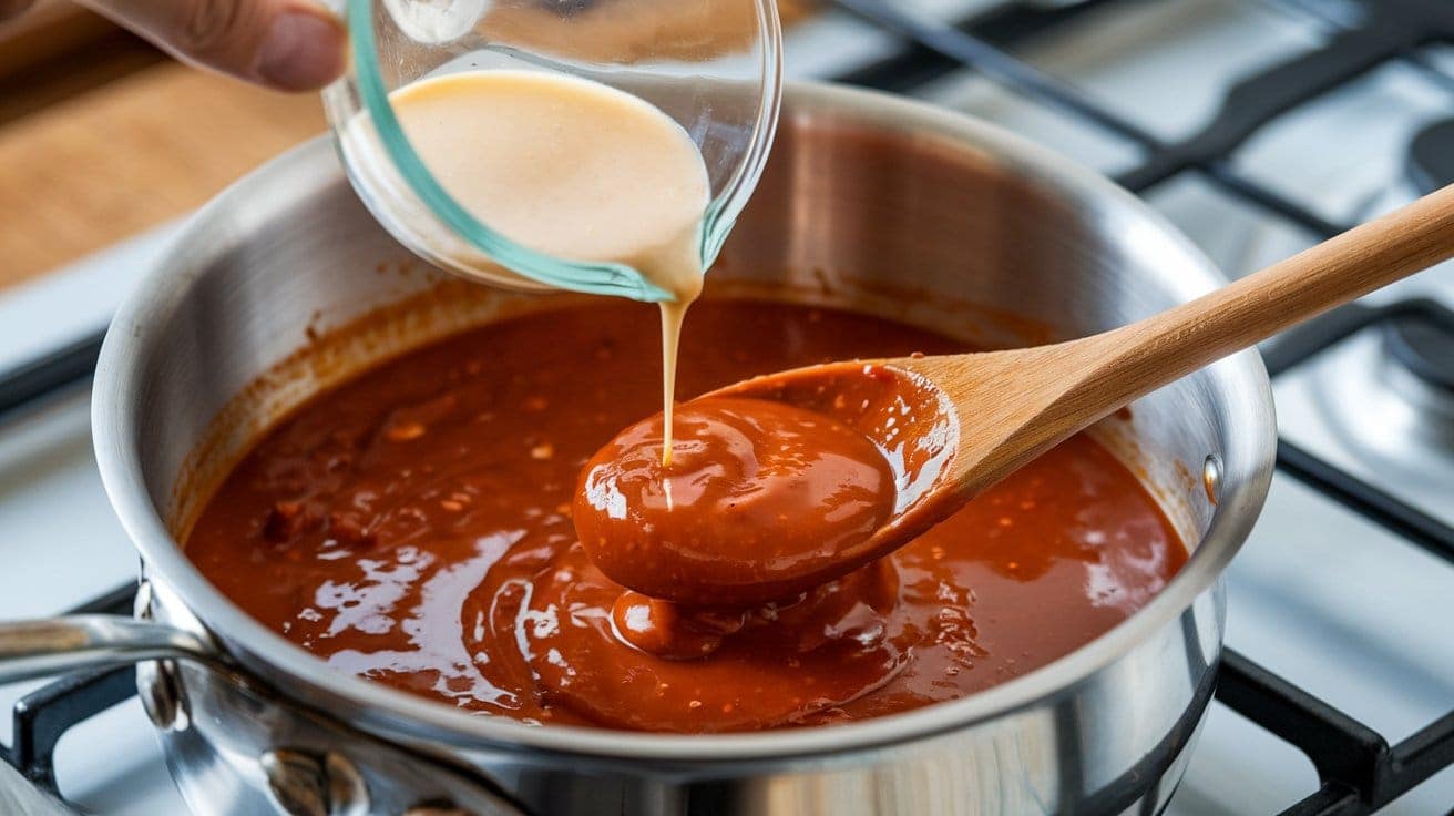 Mix cornstarch with water and pour it into the saucepan while stirring continuously. Let the sauce cook for another 3–5 minutes until it thickens to a syrup-like consistency.