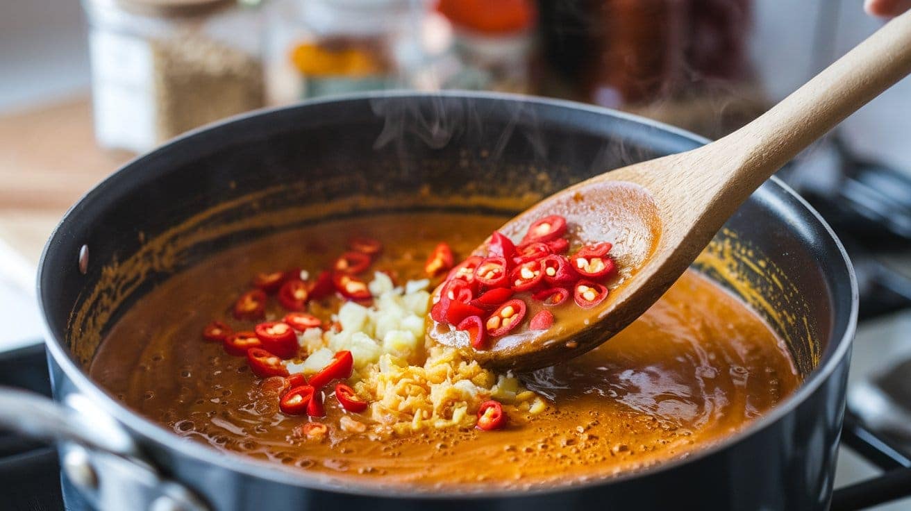 In a medium saucepan, add a tablespoon of vegetable oil over medium heat. Once the oil is hot, add the chopped garlic and chili peppers. Cook for 2–3 minutes, stirring occasionally, until the garlic becomes fragrant and the chili peppers begin to soften.