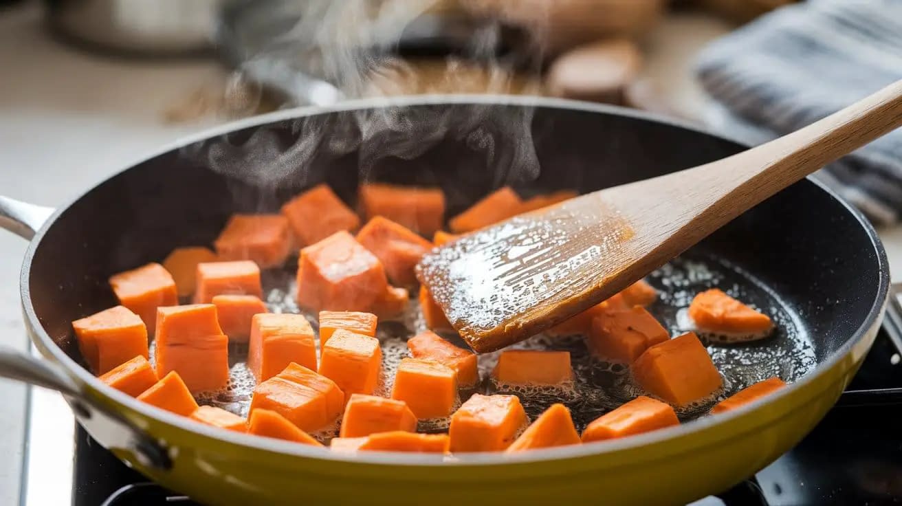 - Cook for 8-10 minutes, stirring occasionally, until the sweet potatoes are tender and lightly crisped on the outside. If needed, add a splash of water to help them cook through without burning.