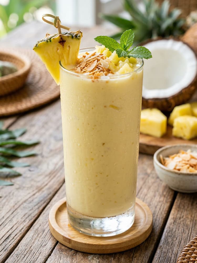 Pour the smoothie into glasses and garnish with toasted coconut flakes, pineapple wedges, or mint leaves.