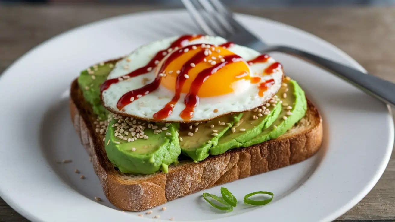 Drizzle Sriracha sauce generously over the avocado and eggs. Sprinkle with sesame seeds and scatter thinly sliced green onions on top for an added crunch and spicy kick.