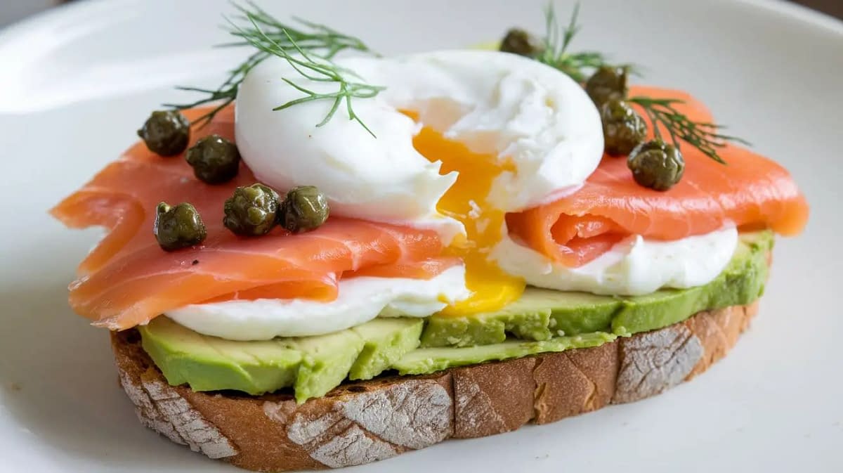 Layer slices of smoked salmon over the avocado spread. Add a dollop of crème fraîche, sprinkle with capers, and garnish with fresh dill. Finish with the poached egg on top for a luxurious flavor combination.