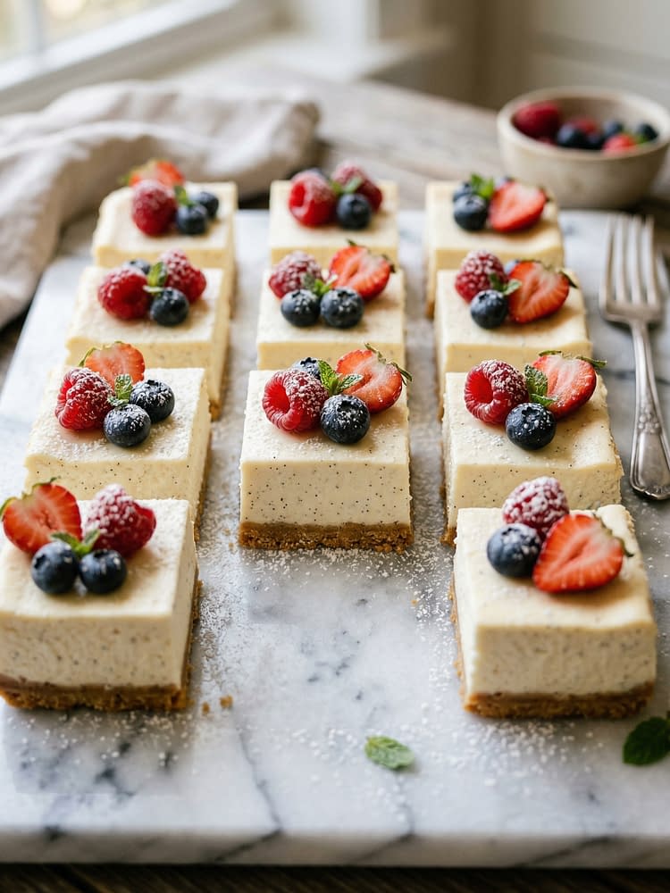 Unlike traditional round cheesecakes, these squares are simpler to prepare, easier to portion, and ideal for gatherings. The balance between the buttery crust and the smooth, vanilla-speckled filling creates a dessert that is both visually appealing and deeply satisfying.
