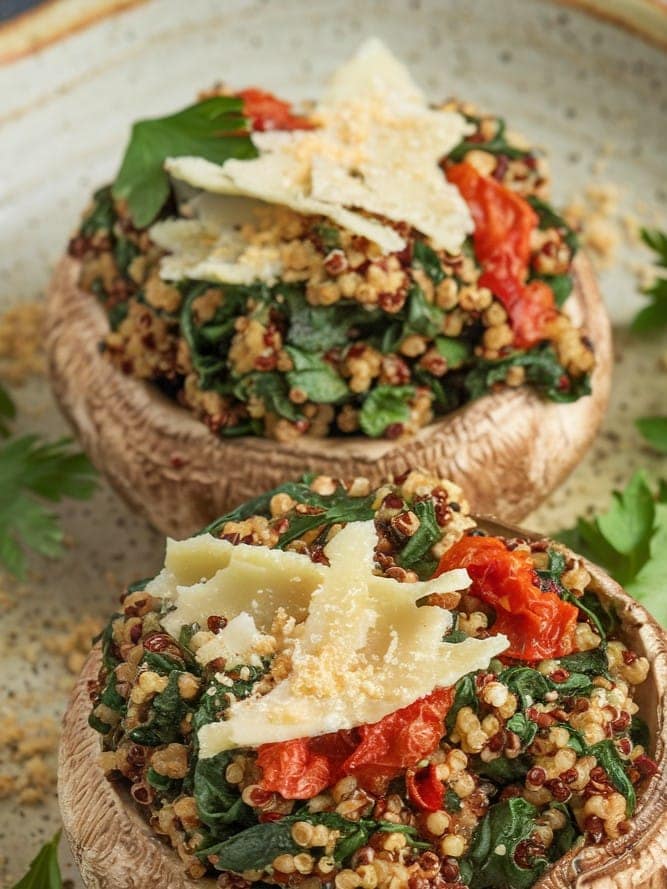 These Vegan Stuffed Portobello Mushrooms are a hearty and flavorful dish, packed with a delicious mixture of quinoa, spinach, and sun-dried tomatoes. Perfect as a main course or appetizer, they are rich in nutrients and full of umami goodness. Ready in under 40 minutes, this easy and healthy recipe is ideal for any season!