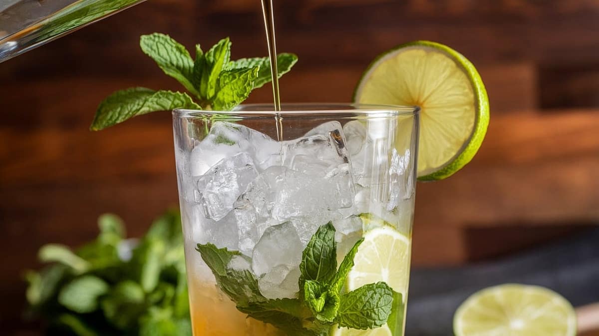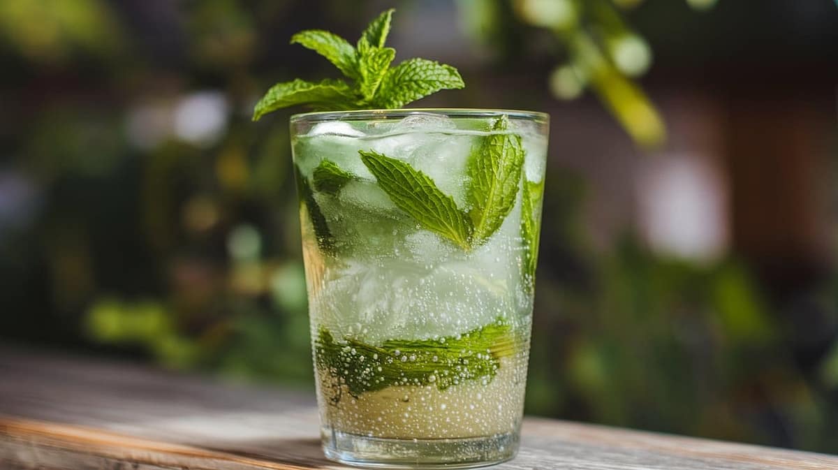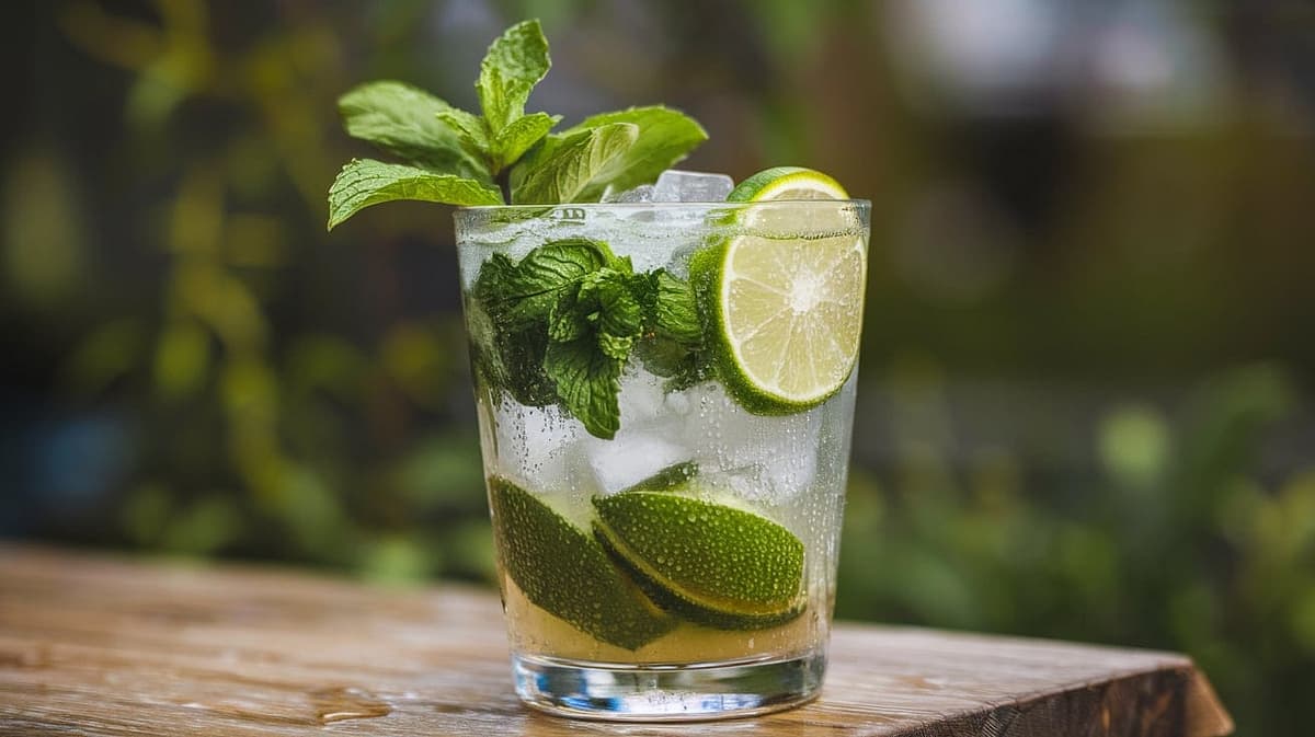 Garnish with a sprig of mint and a lime wheel on the rim of the glass. Serve immediately with a straw.