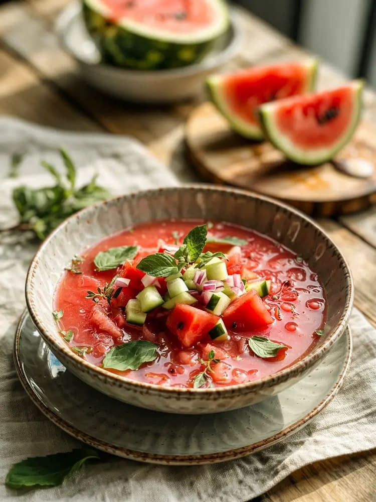 - Before serving, give the soup a gentle stir. Pour into chilled bowls or glasses. Top with the reserved finely diced watermelon, cucumber, and red onion. Garnish with fresh mint or basil leaves and an optional drizzle of olive oil.