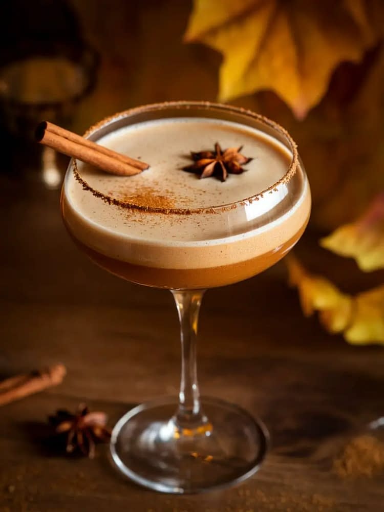 - Strain the mixture into a chilled martini glass. Lightly dust the top with ground cinnamon. Garnish with a cinnamon stick and a star anise for an elegant touch.